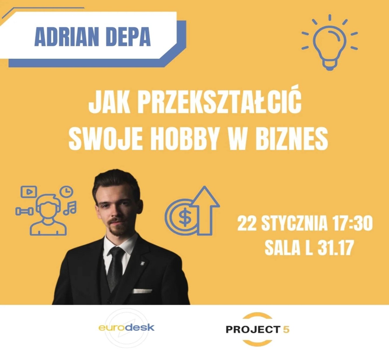 Marzysz o tym, by Twoja pasja stała się czymś więcej niż tylko hobby? Chciałbyś dowiedzieć się, jak krok po kroku przekształcić swoje zainteresowania w dochodowy biznes? Jeśli tak, to to wydarzenie jest dla Ciebie! Warsztaty poprowadzi Adrian Depa, który opowie jak łączyć pasję z przedsiębiorczością. Otrzymasz cenne wskazówki, które pomogą Ci zrealizować swoje marzenia o własnym biznesie! Wydarzenie organizowane jest przez Koło Naukowe Project5, które wspiera młodych ludzi w rozwijaniu swoich umiejętności z zakresu zarządzania projektami i przedsiębiorczości.